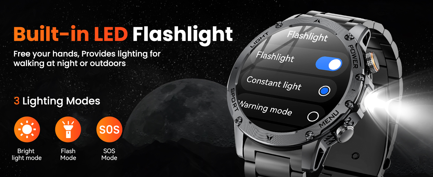 Integrated flashlight with Bright / Flash / SOS modes, lighting up to 10m, perfect for camping, hiking, emergencies, or late-night activities. -