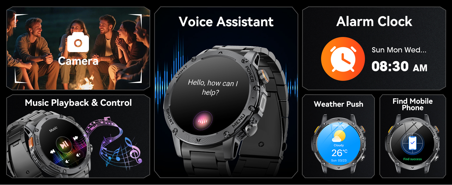 Includes weather forecasts, music and camera control, alarm clock, stopwatch, timer, calculator, sedentary reminder, and Find My Phone. Fully compatible with Android 5.1+ and iOS 9.0+ devices. -