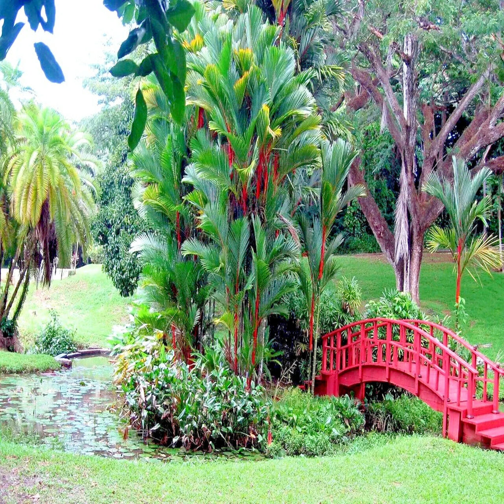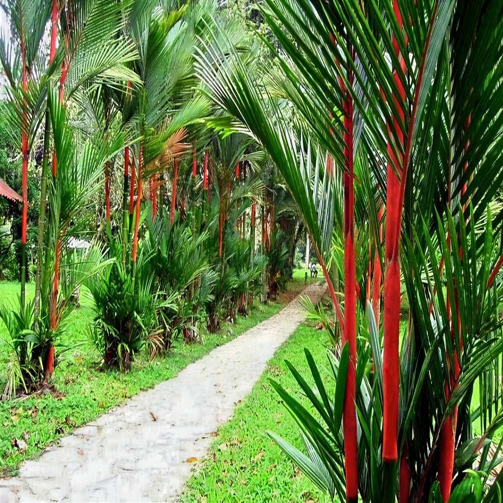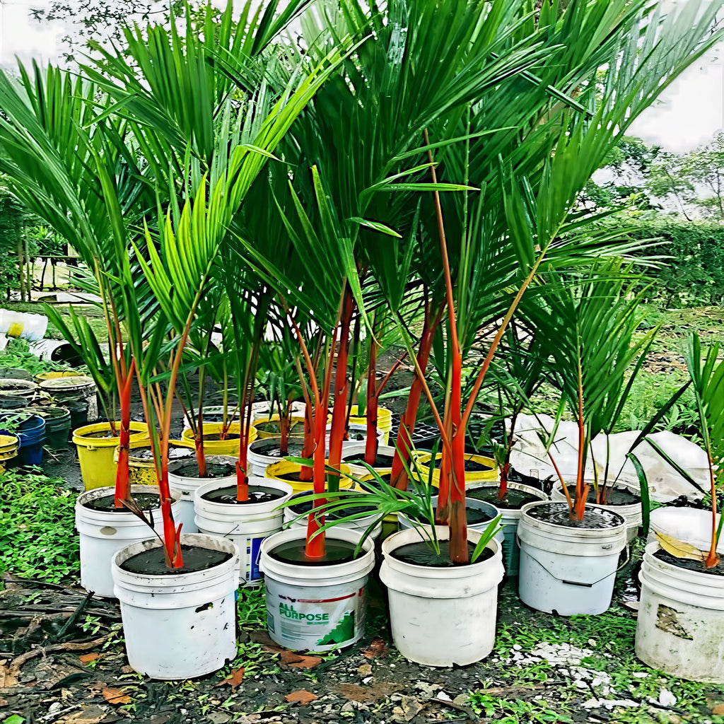 The Red Sealing Wax Palm, also known as the Lipstick Palm, is widely regarded as one of the most beautiful and ornamental palms in the world. Its brilliant, glossy red leaf sheaths and crown shafts create a striking contrast against its lush green fronds, making it a true showpiece in any setting.